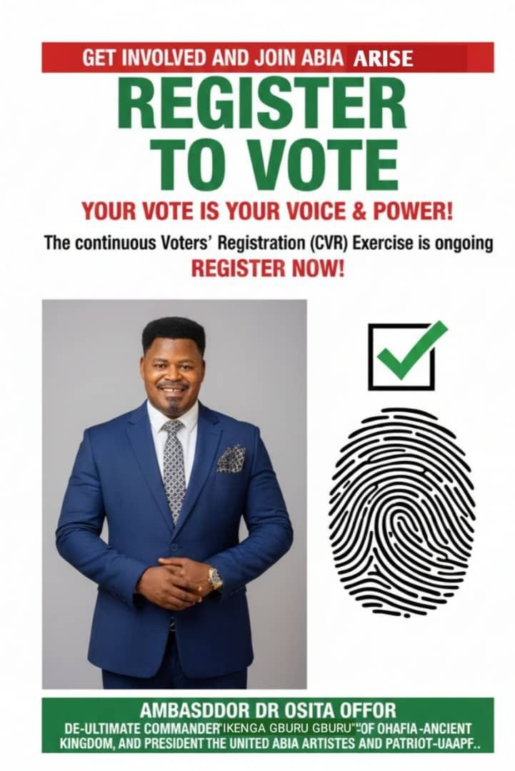 Amb. Dr. Osita Offor therefore urges youths, women, men, professionals, artisans, traders, students, and elders across Abia to take this message seriously. This new month should mark a turning point—a time to move from words to action. Register with Abia Arise, secure your PVC, update or transfer your voter information where necessary, and prepare to fully exercise your civic duty.