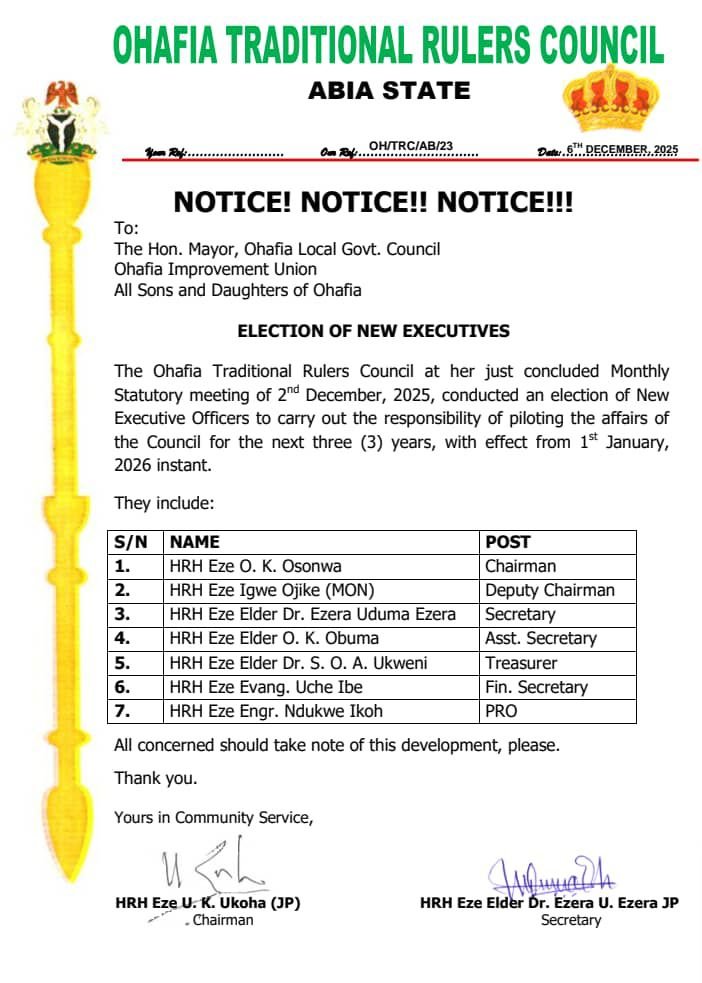 ‎Ohafia, Abia State – The Ohafia Traditional Rulers Council concluded its election of new executive officers during their monthly statutory meeting on Saturday, 2nd December 2025.